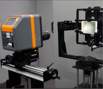 自动化图卡切换支架测试系统、眩光光纤点光源、3%反射率测试卡、 二维成像亮度计、RIQA-CMS 图像质量分析软件、显示器和亮度计移动支架