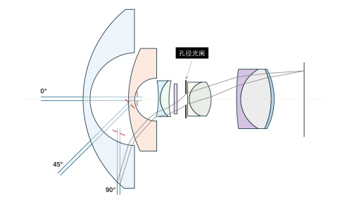 入瞳的概念是孔阑经过其前面的镜组所成的像。根据这一概念,我们可尝试找出鱼眼镜头的入瞳。由图 3 可见,我们设物在无穷远(即入射光为平行光),并选取了 0°、45° 与 90° 三个物方主光线角,在子午面内进行光线追迹可得到三个位置不同的入瞳(以红色短线表示)。0° 时的入瞳与概念一致,其中心位于光轴上,入瞳所在面垂直于光轴,位于第二枚镜片后方。然而,随着主光线角的增大,入瞳开始倾斜,这一现象与图 1 所示现象一致,即入瞳如眼睛的瞳孔一般追踪着观察者。实际上,只有入瞳跟随主光线的倾斜而倾斜,来自景物的入射光方能通过孔阑。试想一下,如果入瞳始终垂直于光轴,那么,对于 90° 的入射光而言,入瞳的投影面积为 0,故无法通过孔阑。因此,从辐射传递的视角看,入瞳的倾斜对鱼眼镜头而言是一种必然。
