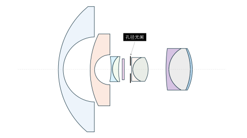 图 2 所示为一种鱼眼镜头的结构示例。我们看到,孔径光阑前有两枚大口径镜片,均为前凸后凹、中间薄的负弯月透镜。这样的前组,可使来自物方视场边缘的极其倾斜的光线向光轴偏折,以通过孔径光阑。这便是鱼眼镜头能够实现广视场角的根本原因。然而,这样的结构也对入瞳的概念形成了挑战。