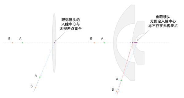 此外,这也引出了另一个有趣的概念——无视差点。由于理想镜头的入瞳中心是固定的,故若有 A、B 两个物点处于同一视场,但物距不同(A 在 B 前),A 会对 B 造成遮挡。而且,只要镜头或 A/B 物点围绕入瞳中心旋转,这种遮挡就会维持不变,或者说,前后景的相对位置关系不变,如图 6 中左图所示。这时的入瞳中心称作无视差点。然而,对于鱼眼镜头来说,设有位于 0 视场的 A/B 两个物点,且 A 完全遮挡住了 B,当镜头或两物点同时绕 0 视场的入瞳中心旋转一定的角度后,A/B 会分别位于不同角度的主光线上,故 A 对 B 不再构成完全遮挡,或者说,前后景的相对位置关系发生了改变,如图 6 中右图所示。因此,图中的鱼眼镜头不存在无视差点。 无视差点的概念,对全景图像拼接十分重要。如果拍摄时,相机围绕无视差点旋转,那么,图像中前后景的位置关系维持不变,图像拼接较为简单。否则,图像拼接时就要试图补偿视差(前后景的位置关系变化)。此外,对于理想成像镜头,入瞳中心、无视差点与几何标定中的相机坐标系原点是重合的,但对于鱼眼镜头,这种假设通常并不成立。
