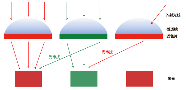 1.当镜头CRA过大于芯片的CRA时,光线会折射到周边的pixel上,导致像素间出现干扰,引发偏色现象。
