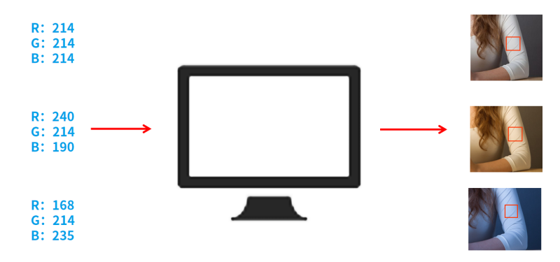 当我们使用显示器直接观察上述三种照明环境下相机传感器输出的图像时,由于衣服对应的 RGB 值出现变化,导致显示器上的衣服也呈现出三种不同的颜色。而我们在照片拍摄现场观察到的衣服,不受照明环境影响,几乎始终是白色的。