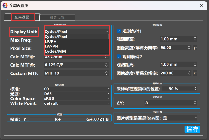 打开RIQA软件,点击”设置“,选择“全局设置”后,根据需求修改“Display Unit“的单位,即可修改输出结果的单位。