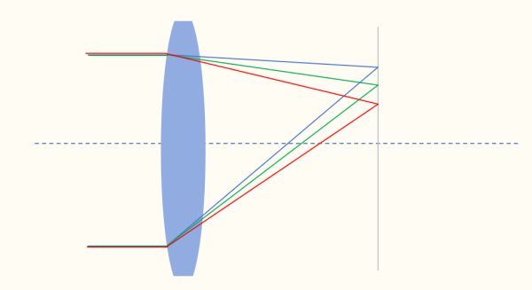 色差(Chromatic Aberration, CA)指镜头无法把不同波长的光汇聚到同一像点,导致高对比边缘出现彩色镶边(常见紫边、绿边、红边)的现象。其本质是光学材料的色散——折射率 n 随 λ 变化(如:短波折射率越大),使白光中各颜色走不同路径、落在不同位置而引发的一种像差现象。