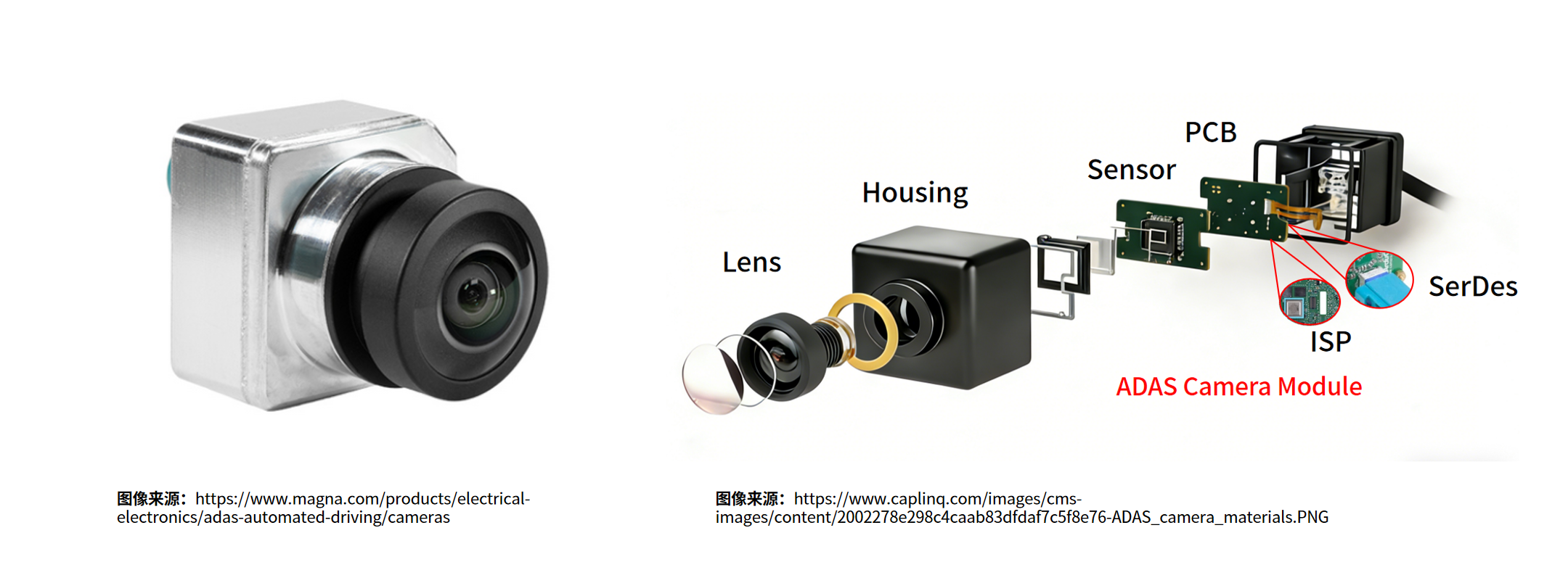 车载类摄像头模组(CCM)的核心组件包括光学镜头组(Lens)、图像传感器(Sensor)、图像处理器(ISP)、串行器(Serializer)等。