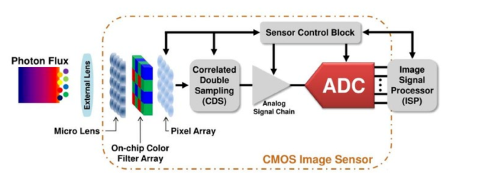 - 图像传感器:主流为 CMOS 型,其感光阵列(Pixel Array)负责将接收的光信号转换为模拟电信号,再通过内部集成的 ADC进行模数转换,将电信号转换为数字信号(即 Bayer Raw Data),并传输至 ISP 进行后续处理。