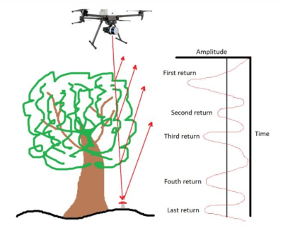 该图展示了激光脉冲穿透植被时,先后在树冠、枝干、地面产生多次回波的过程,清晰体现了多回波记录的物理机制。