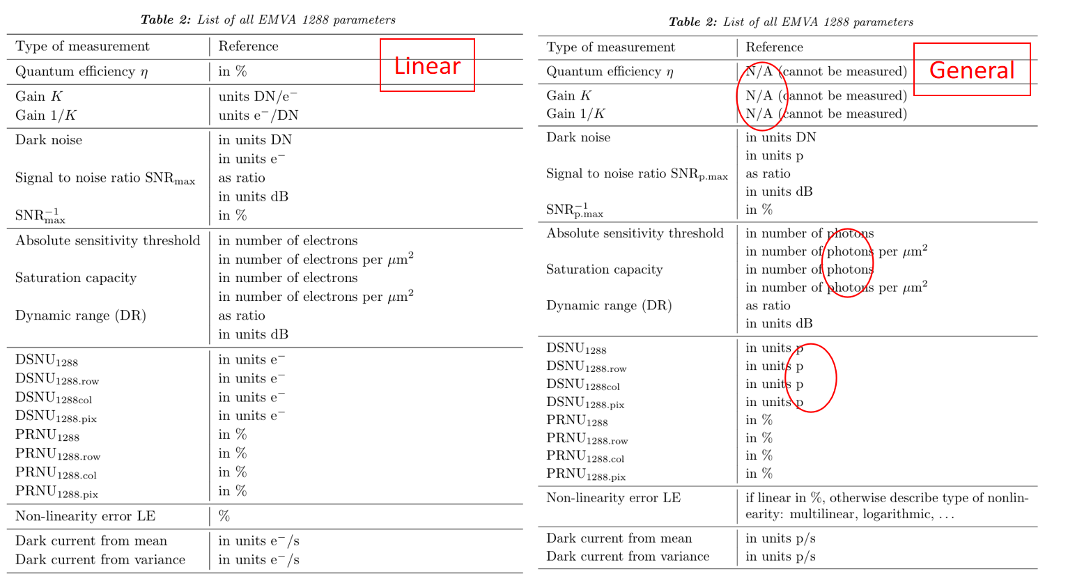 线性模型为白箱模型,可测量绝对量子效率、系统增益等电子级物理参数,仅适用于线性无预处理传感器;通用模型基于黑箱理论,无法测量绝对量子效率、系统增益等内部物理参数,仅能以光子为单位表征整体性能,适用于各类非线性相机。