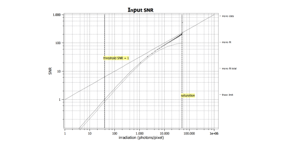 - 最大信噪比 (Maximum SNR):指信号达到饱和容量时的信噪比极值,通常以 dB 或 bits 为单位呈现。该值由饱和容量的平方根决定,界定了相机在理想光照下的图像质量上限,是衡量高亮度区域微小对比度差异(高光细节区分度)的决定性指标。