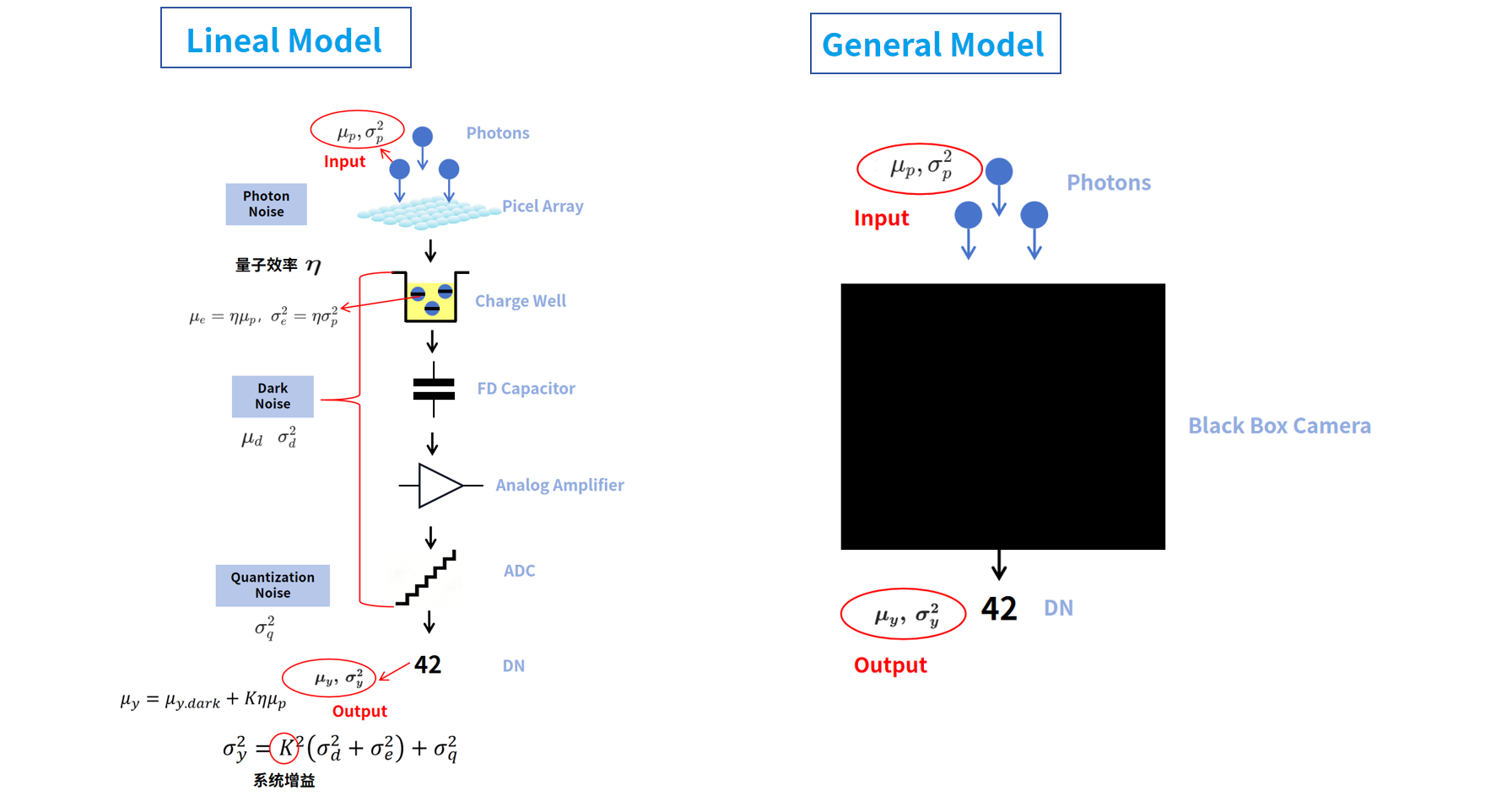 - General(通用模型):全新分支,适用于各类图像传感器与相机,兼容线性与非线性成像系统。该模型基于黑箱理论,不再依赖线性响应假设,仅通过分析输出图像的统计特性,实现对复杂相机系统进行标准化性能表征(如信噪比SNR等)。