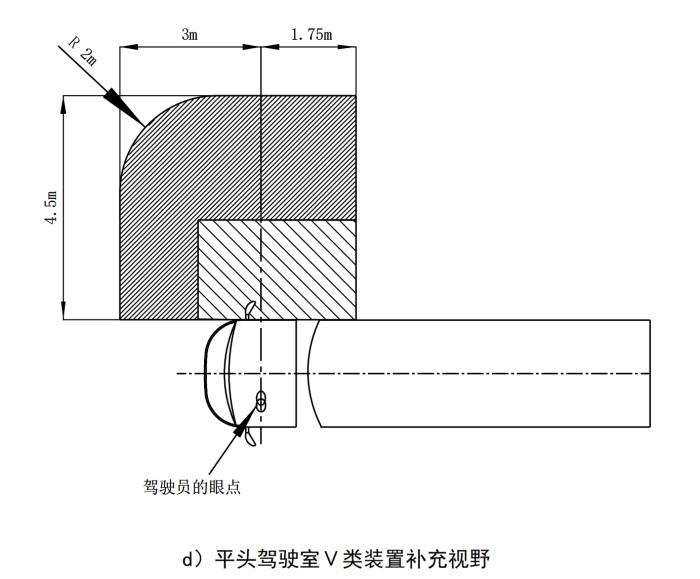 驾驶员应能在水平路面上看到2.5 m宽、由平行于车辆纵向基准面并且通过驾驶员侧车辆最外侧点 的平面所界定,并从驾驶员眼点后方10 m处延伸至地平线的区域(见图中驾驶员侧阴影部分)。