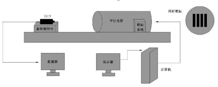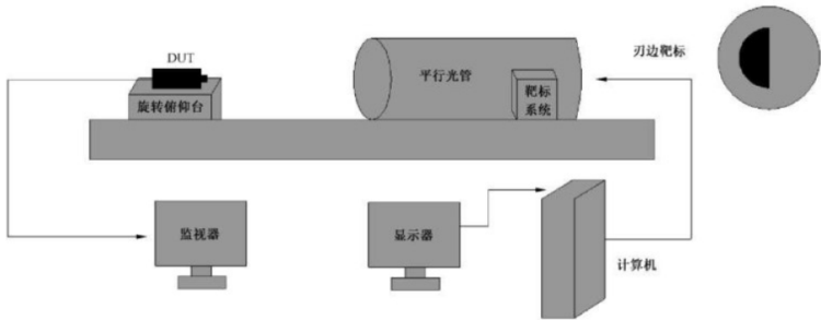 将DUT水平固定在精度不低于 0.5°的分度盘中心,选择合适特征频率的四杆靶标。调整DUT镜面与靶标的距离满足最小对焦距离,镜头中心与分度盘中心保持一致,镜头中心与靶标平面垂直且与靶标中心重合。设置靶标与黑体背景温差使DUT清晰成像。其设备布置参考下图: