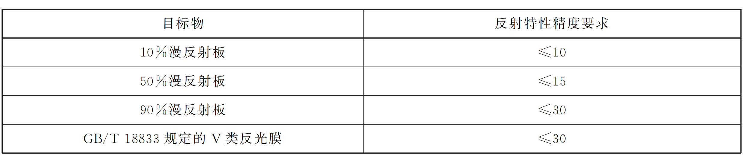 指标:对不同反射率目标(10%,50%,90%,V类反光膜)的反射特性测量精度有明确要求(见下表)。