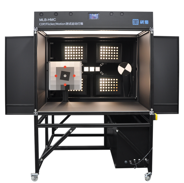 本次测试将用的测试设备为研鼎自研的MLB-HMC ADAS摄像头综测仪,通过后部的4个透射式灯箱,再搭配4张不同密度的灰阶图卡,通过光源设定相关参数,得到高动态范围下不同的亮度图块分布,以测量成像系统的CDP、CSNR指标。