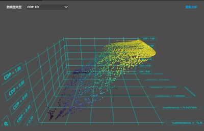 三轴分别代表亮度、对比度、CDP,直观呈现了三者之间的关联,可清晰反映相机在不同场景下的对比度表现能力。CDP的数值越高,代表模组的检测性能越好。一般来说,在低亮度和低对比度的位置,CDP的值往往较低,反之较高。