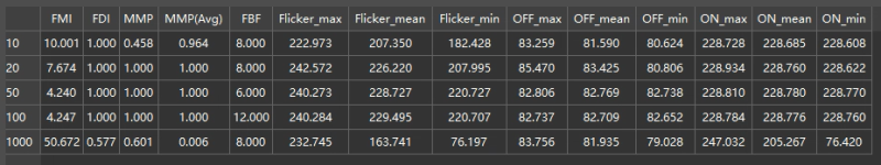 | MMP(Avg) | 测量闪烁光源亮度在闪烁光源光源阈值亮度区间的可能性 |