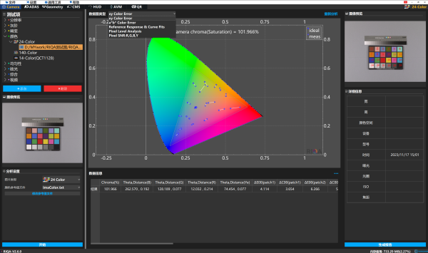 在测试结果中包含多个测试结果,如图片饱和度,色差,信噪比,色坐标分析图等等。可保存PDF,TXT,Excel报告查看测试结果及示意图。