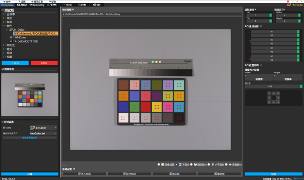 2.把图片导入RIQA图像质量测试软件后,选择对应图卡类型及颜色参考值文件后,点击“开始”,软件自动框选出分析区域,框选区域不小于38*38pixel,也可手动选择分析区域;
