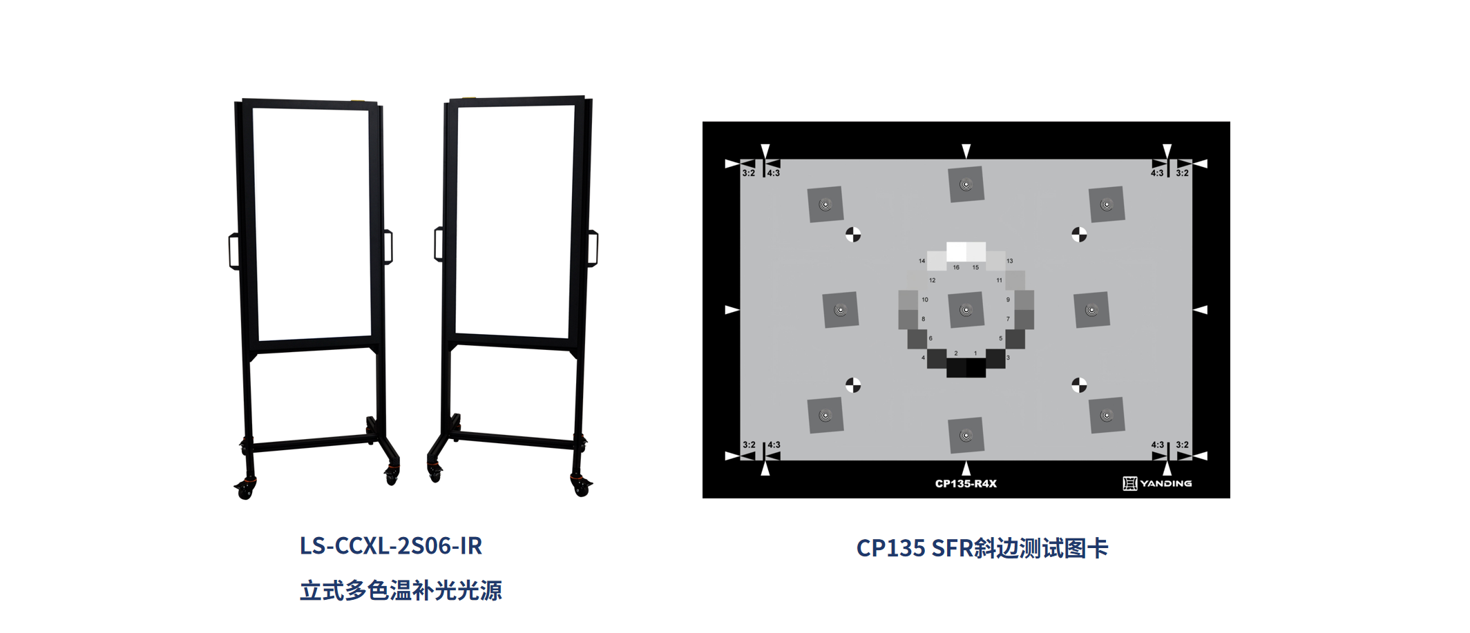 本次 e-SFR 测试将用到的测试设备有LS-CCXL-2S06-IR 立式多色温补光光源和CP135 斜边 SFR 测试图卡。