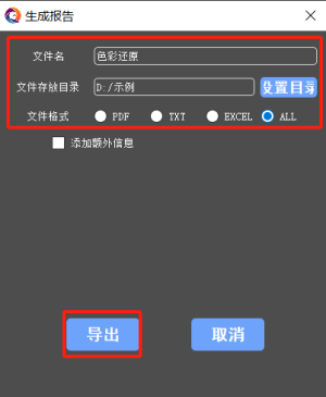 (6) 跳转生成报告界面,需要选择输出文件的格式,输入文件名和文件地址,点击“导出”按钮。报告成功生成后提示报告生成成功。