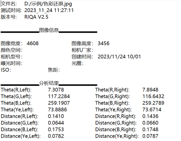 (5) 软件中间靠下区域展示所拍摄色卡图片的检测结果,分别是各个色块与白色块在色彩空间的色度角与欧几里得距离。右击右上角可查看ROI区域的命名顺序。点击“生成报告”按钮。