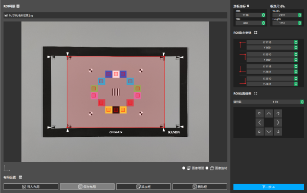 (3) 出现“ROI调整”界面,出现默认的ROI区域。可调整ROI框选需要检测的色块。点击“下一步”按钮。