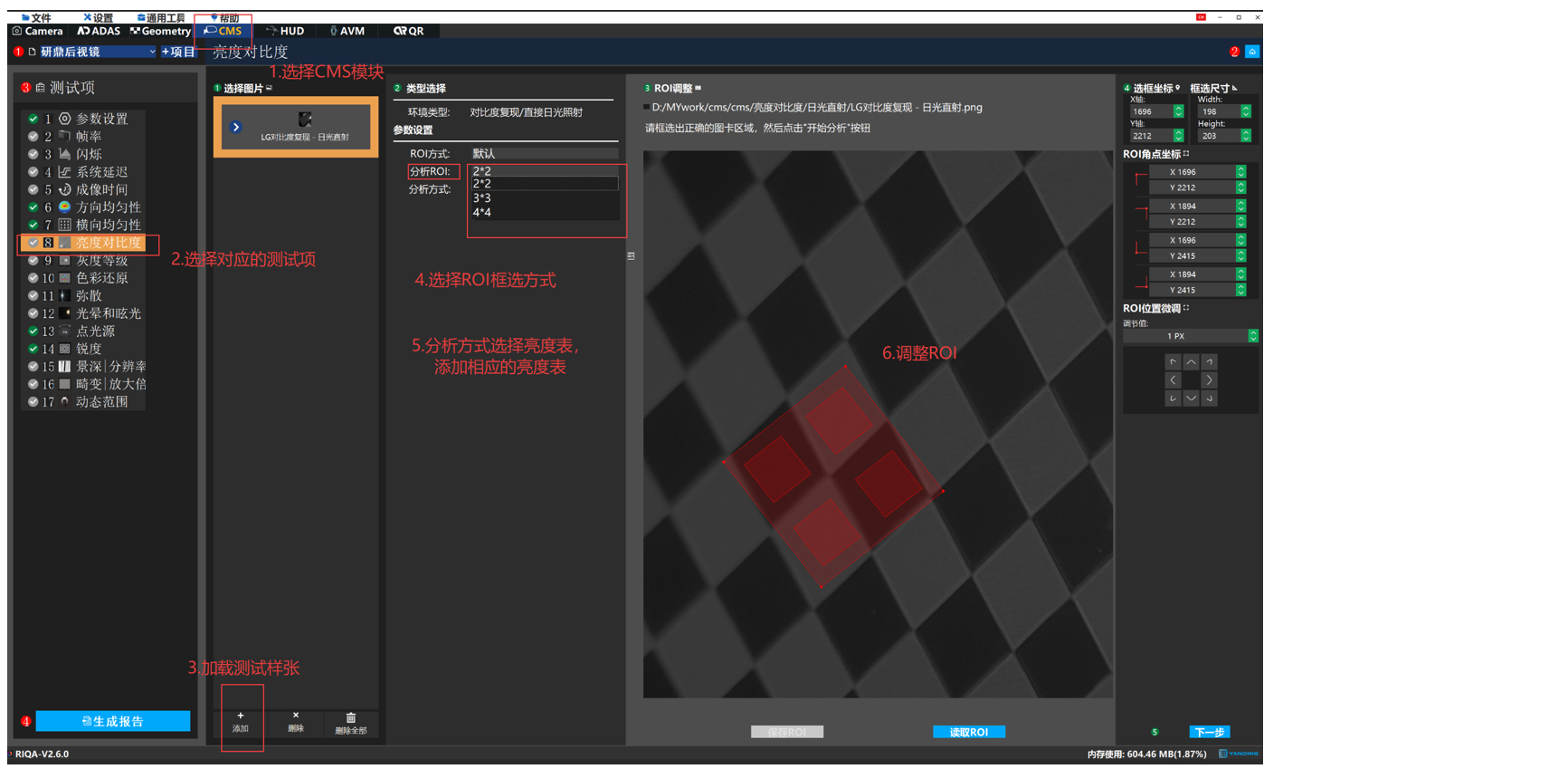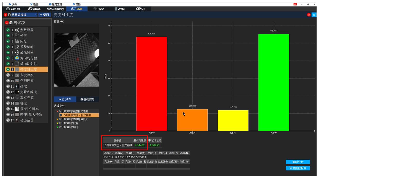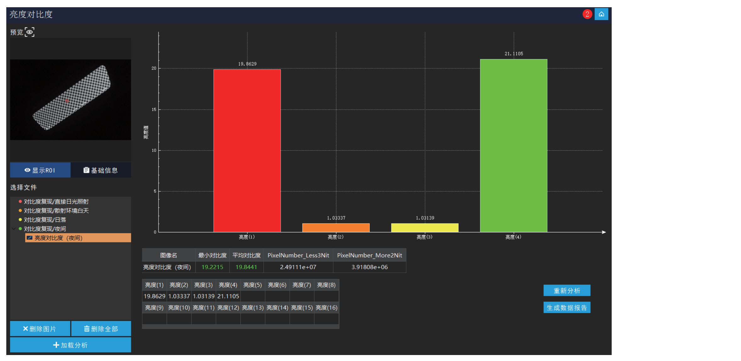 使用RIQA图像质量软件CMS模块的亮度对比度项分析测试样张。RIQA亮度对比度模块支持选择2*2、3*3、4*4的ROI。ROI 框选中心区域后点击分析即可直接出结果数据。