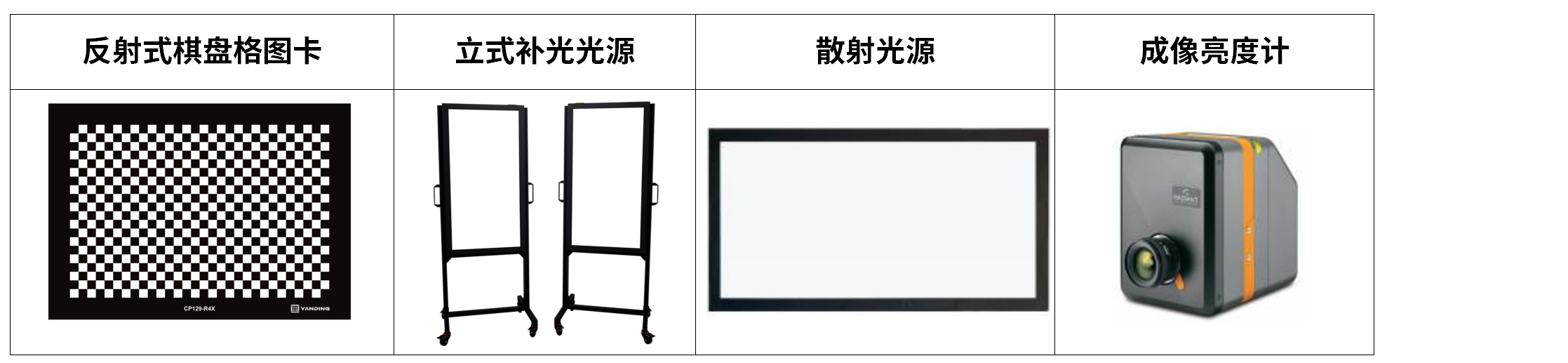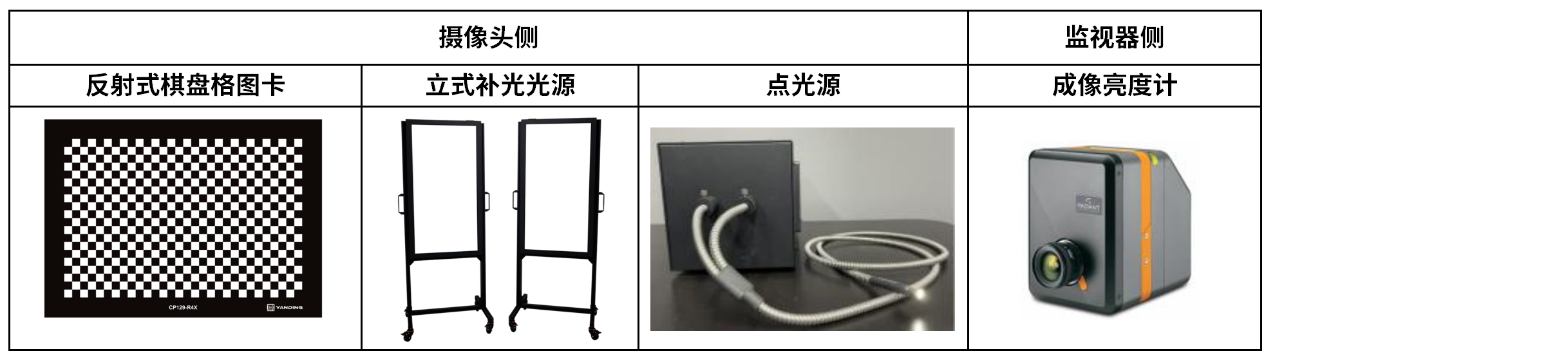 对比度图卡(反射式棋盘格图卡)、图卡照明光源(立式补光光源)、待测摄像头、测试监视器和参考摄像头(成像亮度计)。