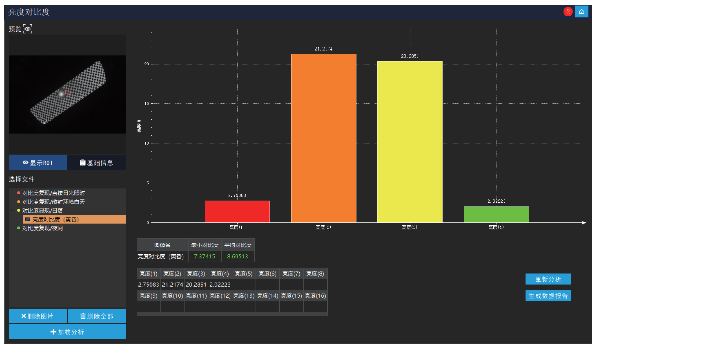 使用RIQA图像质量软件CMS模块的亮度对比度项分析测试样张,其ROI分析区域是靠近光源但不受光晕影响的区域。