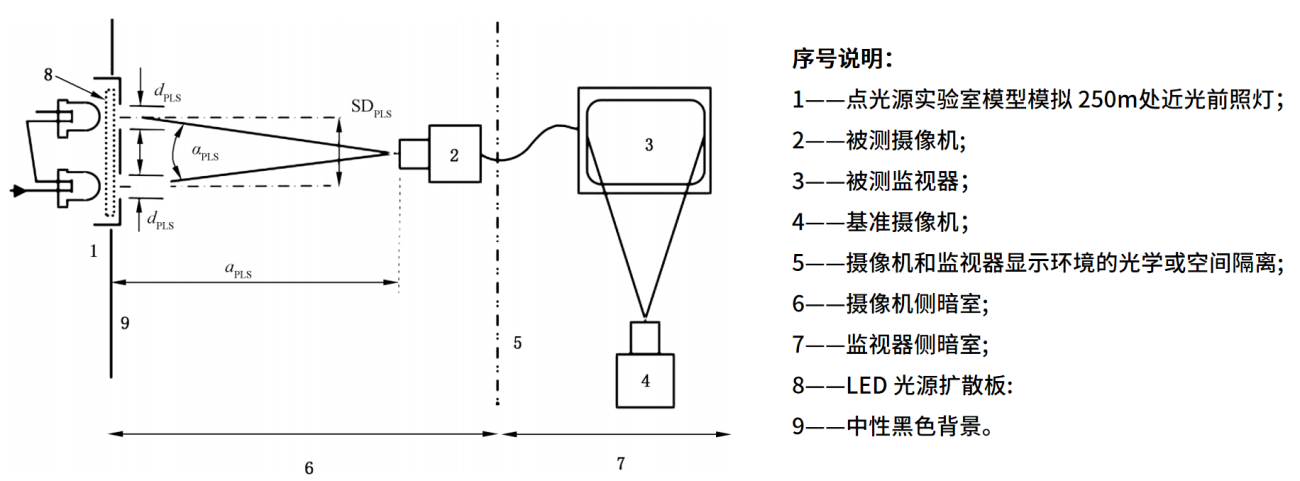 双点光源模拟器是模拟位于 250 m 距离处的一套车辆近光前照灯,实验室测试中通常会通过相关换算来在10m内进行测试。从摄像机到点光源模拟器的距离$\alpha_{PLS}$应在 CMS摄像机景深范围内。