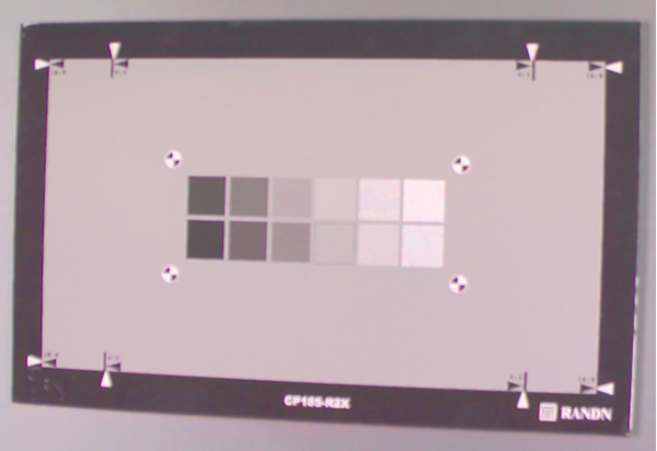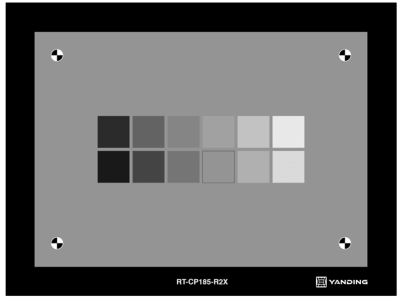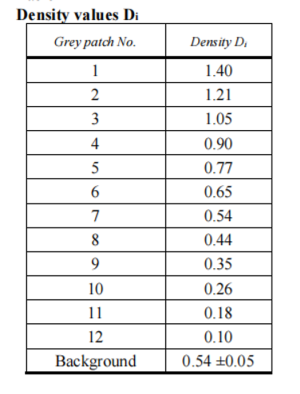灰度等级再现图卡必须包括12 个不同色调密度的灰色块;密度值Di 必须符合ISO 14524:2009针对低对比度20:1 的定义值。色块背景必须由密度值Di 为0.54±0.05 的中性灰覆盖。可使用具有Lambertian 特性的反射及透射图。