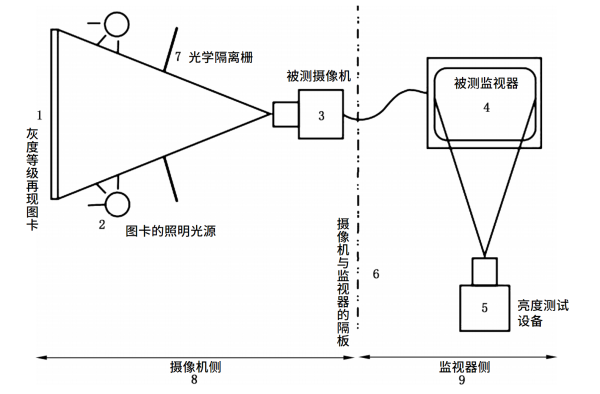 c) 调整摄像机侧光源色温为 6500 K ± 1500 K,图卡上的照度为 500 lx ;监视器侧环境照度应低于 10lx;