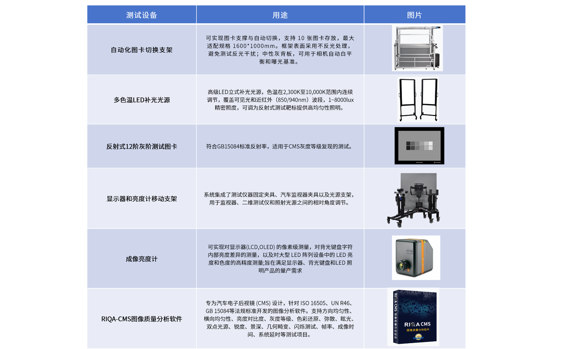 自动化图卡切换支架测试系统、多色温LED补光光源(可见光和近红外)、 反射式12阶灰阶测试图卡、 二维成像亮度计、RIQA-CMS 图像质量分析软件、显示器和亮度计移动支架