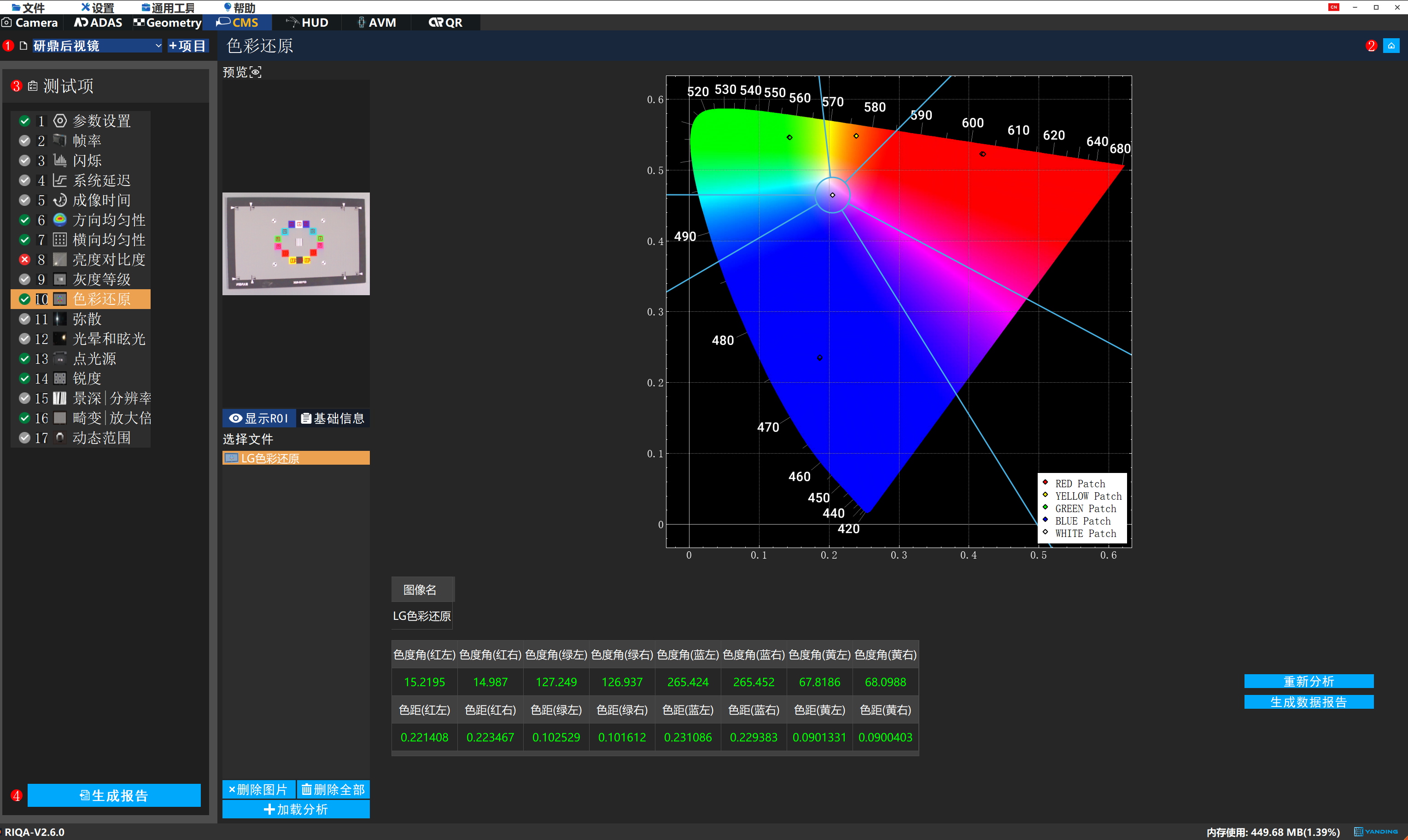 基于色彩还原测试图卡,使用成像亮度计拍摄显示器屏幕,测量各单个色块的色坐标与各个色块到参考白色色块之间的色度角和欧几里得距离来量化CMS的色彩还原能力。
