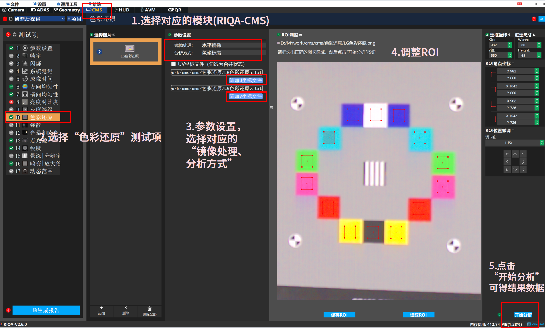 色彩是驾驶员识别交通信号灯、道路标线等路况信息的关键,精准的色彩还原是行车安全的基础,其还原能力也是 CMS 量产上路的合规要求。色彩还原测试通过验证DUT对目标图卡色彩的复现效果是否达标,保障 CMS 的使用安全与可靠性。